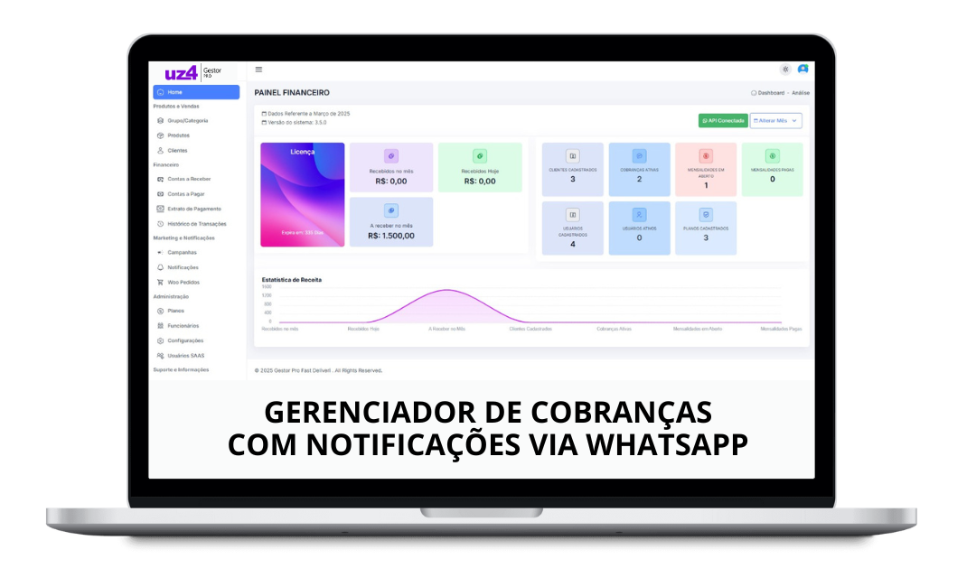 É um sistema completo que automatiza e otimiza a gestão financeira e de clientes do seu negócio, oferecendo ferramentas como notificações via WhatsApp, geração de faturas e muito mais.